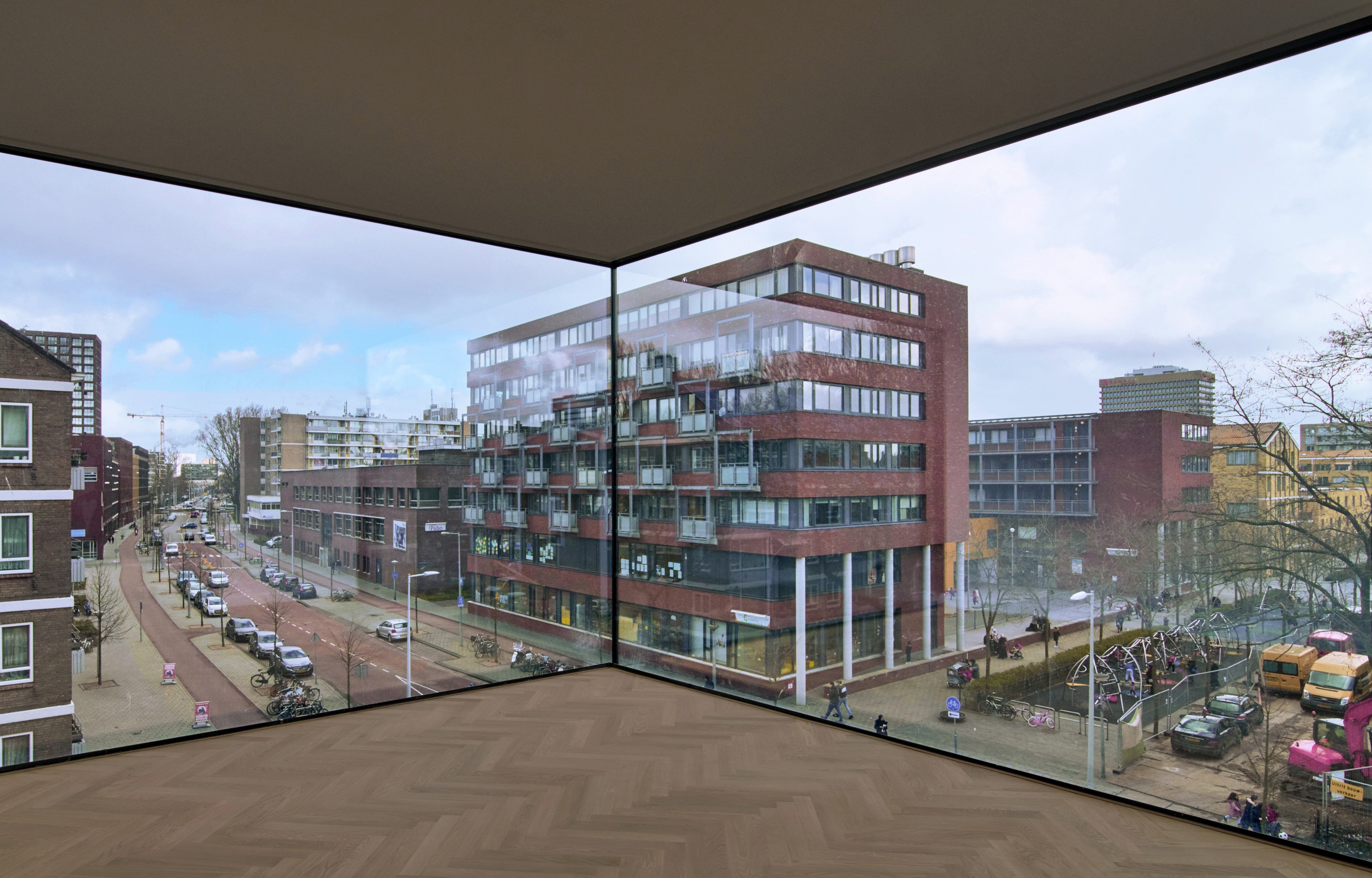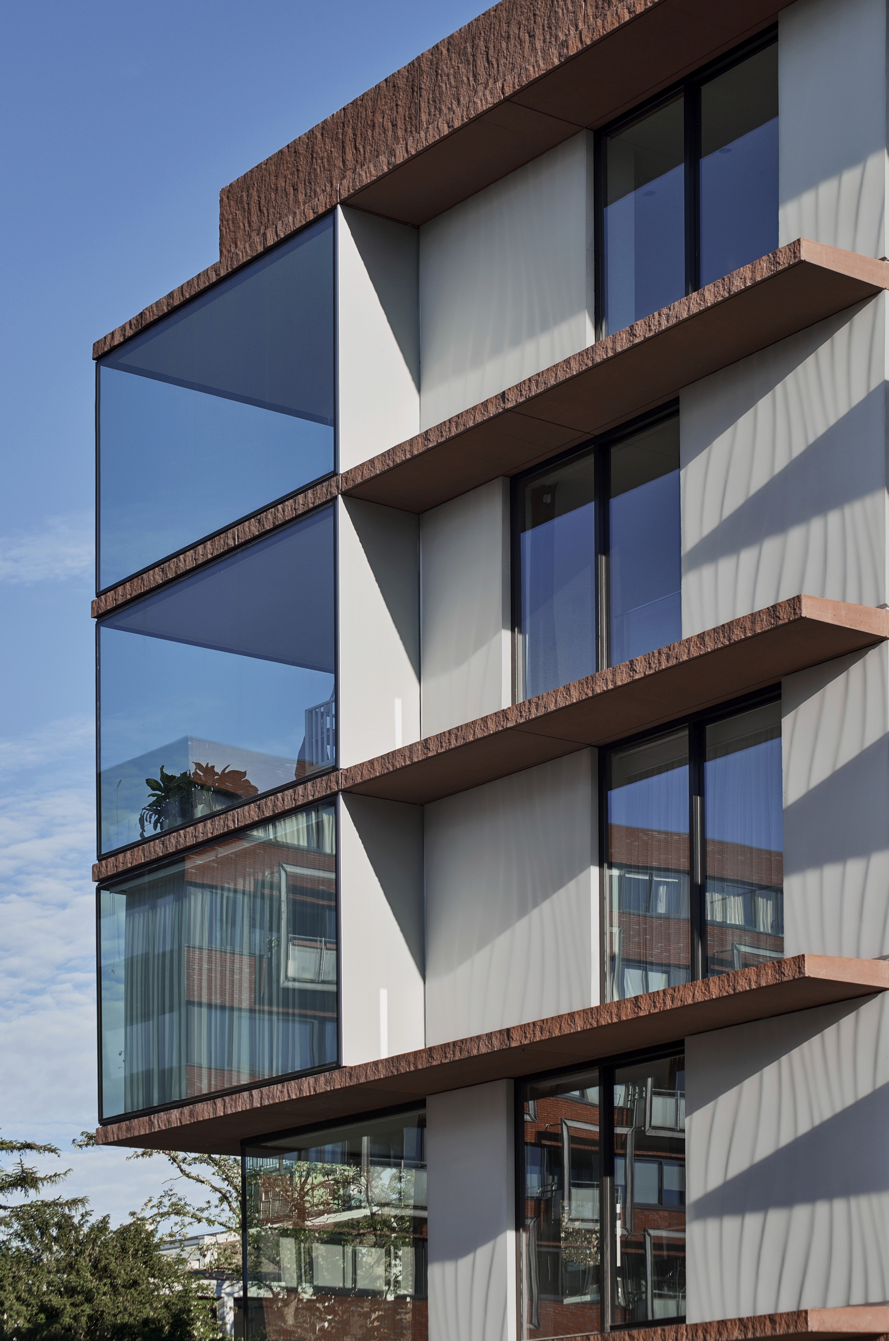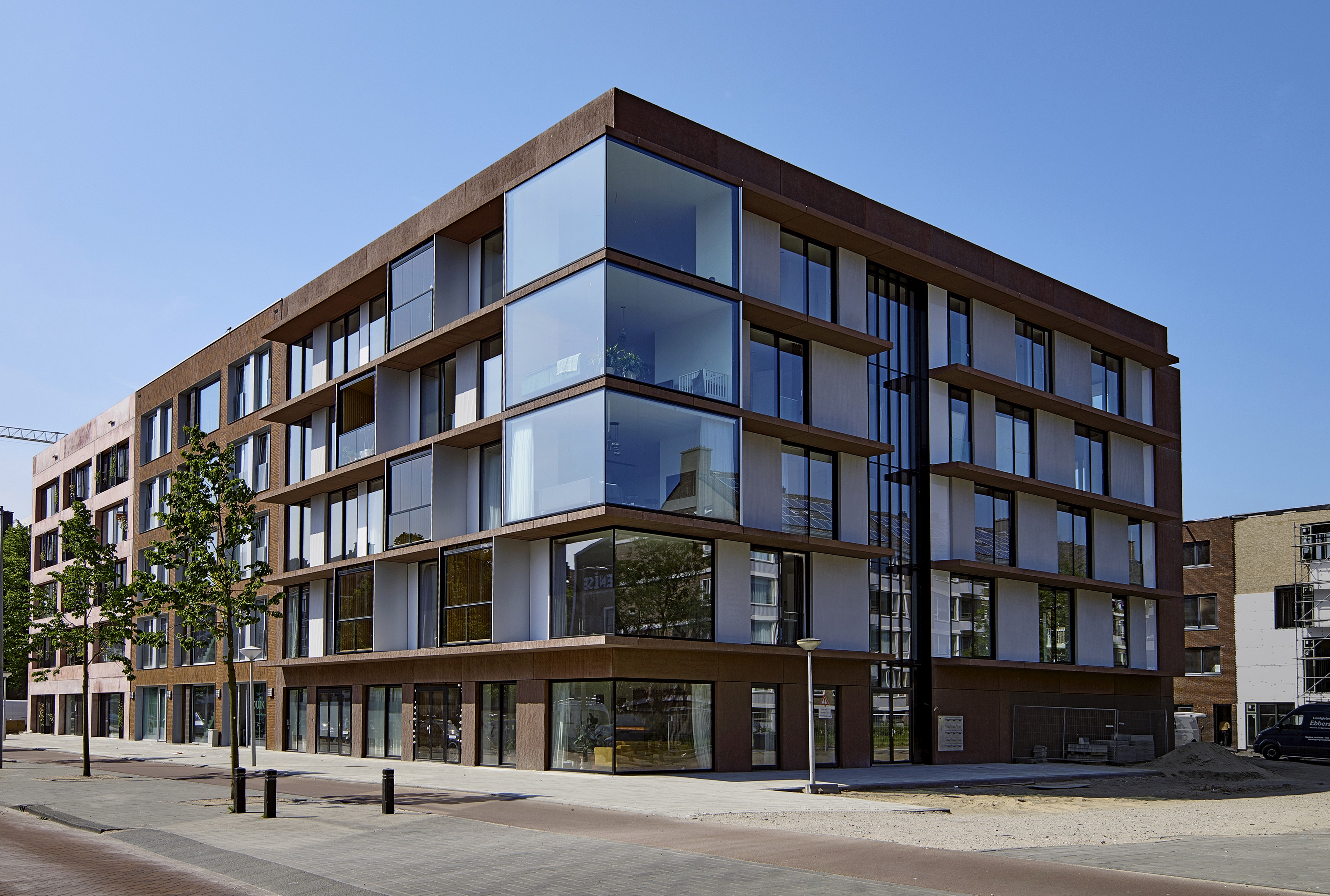 The brief was to design a building with a stone-like facade. Stone? We think the municipality was referring to brick, but brick is most commonly found in the city center. Our site is located in the heart of the Van Eesteren Plan: fast, prefabricated, and concrete. So we created a stone-like facade out of concrete. We added black and red sand to the concrete, giving it an iron-like color. The building stands like a monolith: a red rock in its surroundings. The south- and west-facing apartments all have spacious loggias. Only the five apartments in the northeast corner couldn't be given a large outdoor space. While they do get morning sun, they face a busy road. These apartments, initially considered the least quality-conscious, were given the highest quality. On the east side, they received winter gardens with sliding doors that can be completely retracted. In the corners, we created a 4.5 by 4.5-meter bay window: an explosion of space, with an open corner of two glued glass panes, and therefore without a jamb or pillar. One of the residents is installing a grand piano there. The winter garden and the bay window are the only spaces in the facade that fully fill the extra meter in the overhang. The ground-floor apartment didn't have a bay window, but it did have a sidewalk under the overhang: perfect for placing a table, bench, or plants.