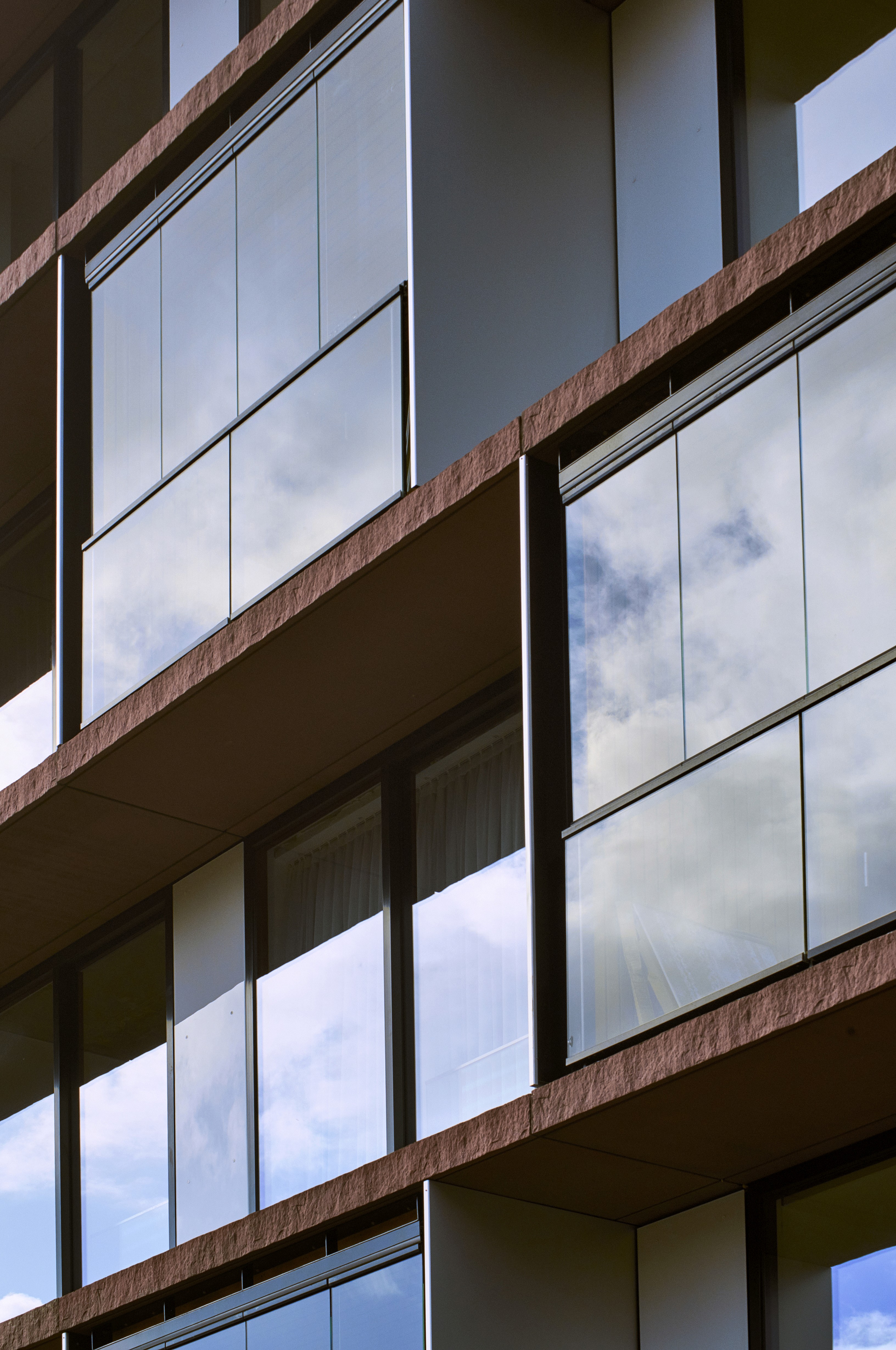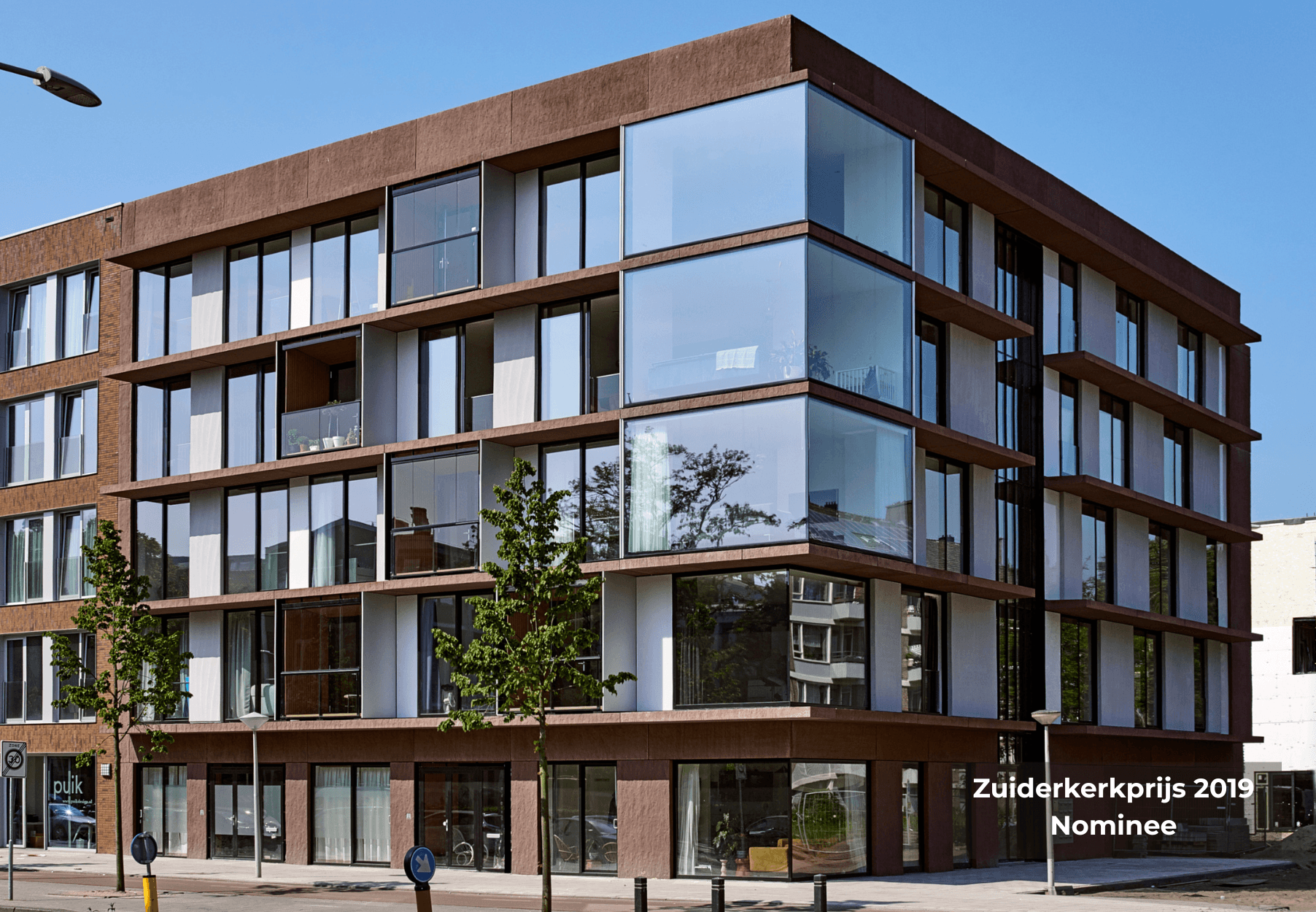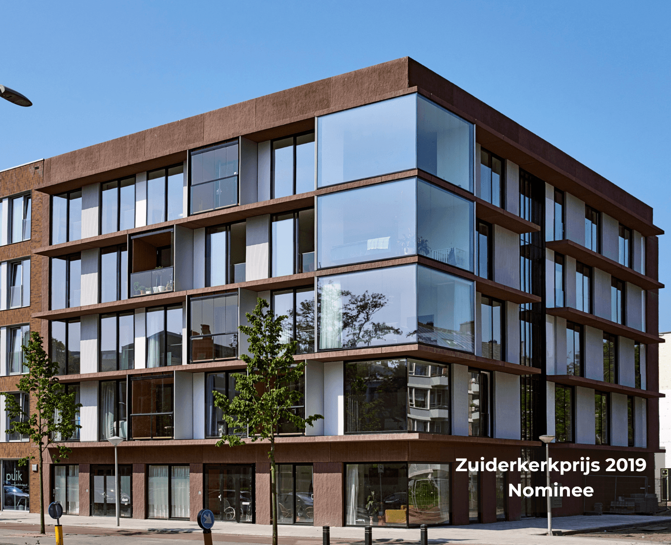 The brief was to design a building with a stone-like facade. Stone? We think the municipality was referring to brick, but brick is most commonly found in the city center. Our site is located in the heart of the Van Eesteren Plan: fast, prefabricated, and concrete. So we created a stone-like facade out of concrete. We added black and red sand to the concrete, giving it an iron-like color. The building stands like a monolith: a red rock in its surroundings. The south- and west-facing apartments all have spacious loggias. Only the five apartments in the northeast corner couldn't be given a large outdoor space. While they do get morning sun, they face a busy road. These apartments, initially considered the least quality-conscious, were given the highest quality. On the east side, they received winter gardens with sliding doors that can be completely retracted. In the corners, we created a 4.5 by 4.5-meter bay window: an explosion of space, with an open corner of two glued glass panes, and therefore without a jamb or pillar. One of the residents is installing a grand piano there. The winter garden and the bay window are the only spaces in the facade that fully fill the extra meter in the overhang. The ground-floor apartment didn't have a bay window, but it did have a sidewalk under the overhang: perfect for placing a table, bench, or plants.