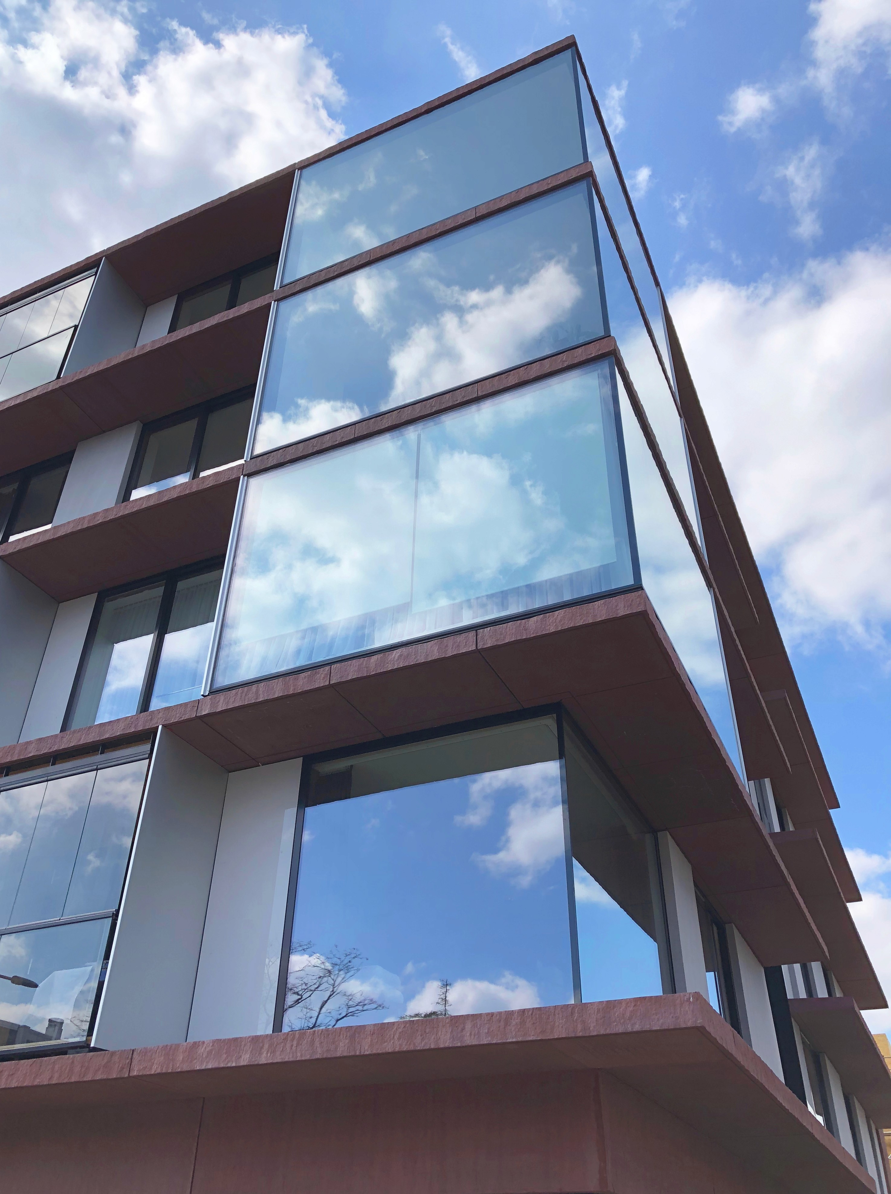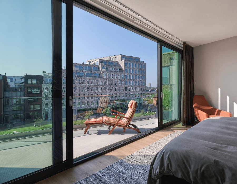 The cantilevered corner opens up toward the city. A standout feature of Go West is the large glass bow windows in the northeastern corner. Measuring 4.5 by 3 meters, these striking elements provide panoramic views and an abundance of natural light.
