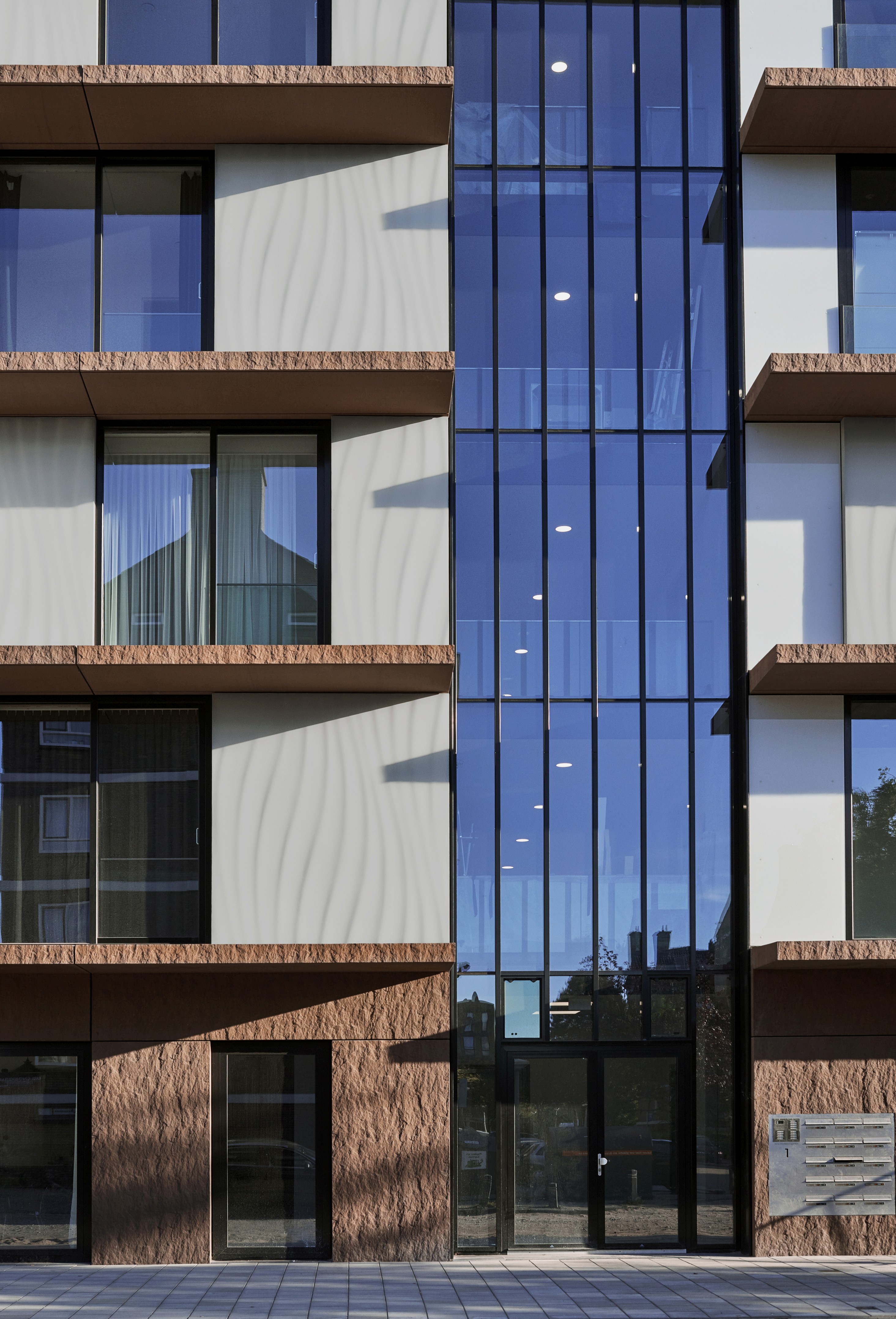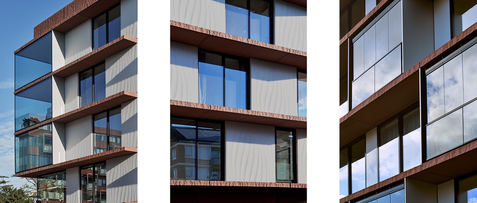 Go West’s façades feature a rhythmic composition of patterned panels, brushed aluminum, and enameled glass. Wavy textures catch and reflect sunlight, shifting in appearance throughout the day. Combined with winter gardens and bow windows, these elements create a lively and dynamic façade.