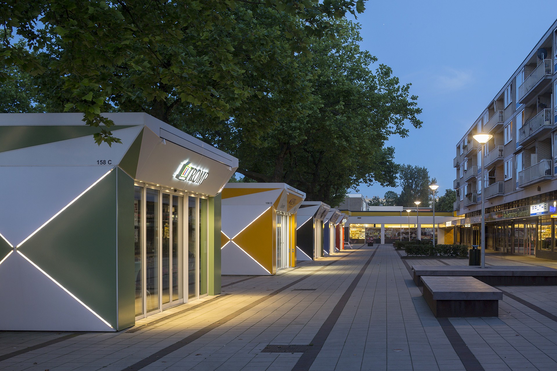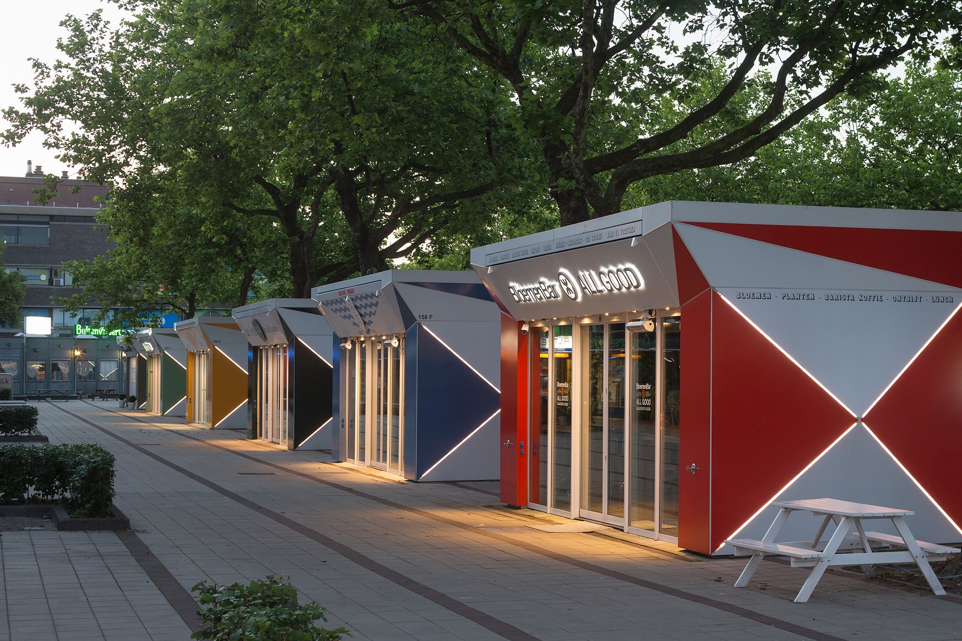 Thanks to integrated lighting across all parts of the structures, the kiosks remain visible and vibrant after dark. They bring subtle liveliness to the square, ensuring it feels active and welcoming even in the evening hours.