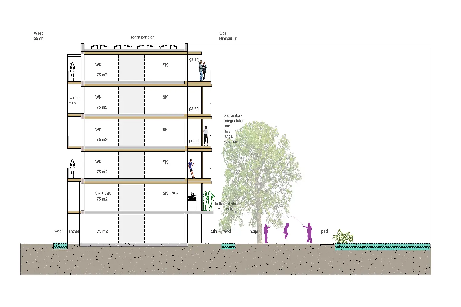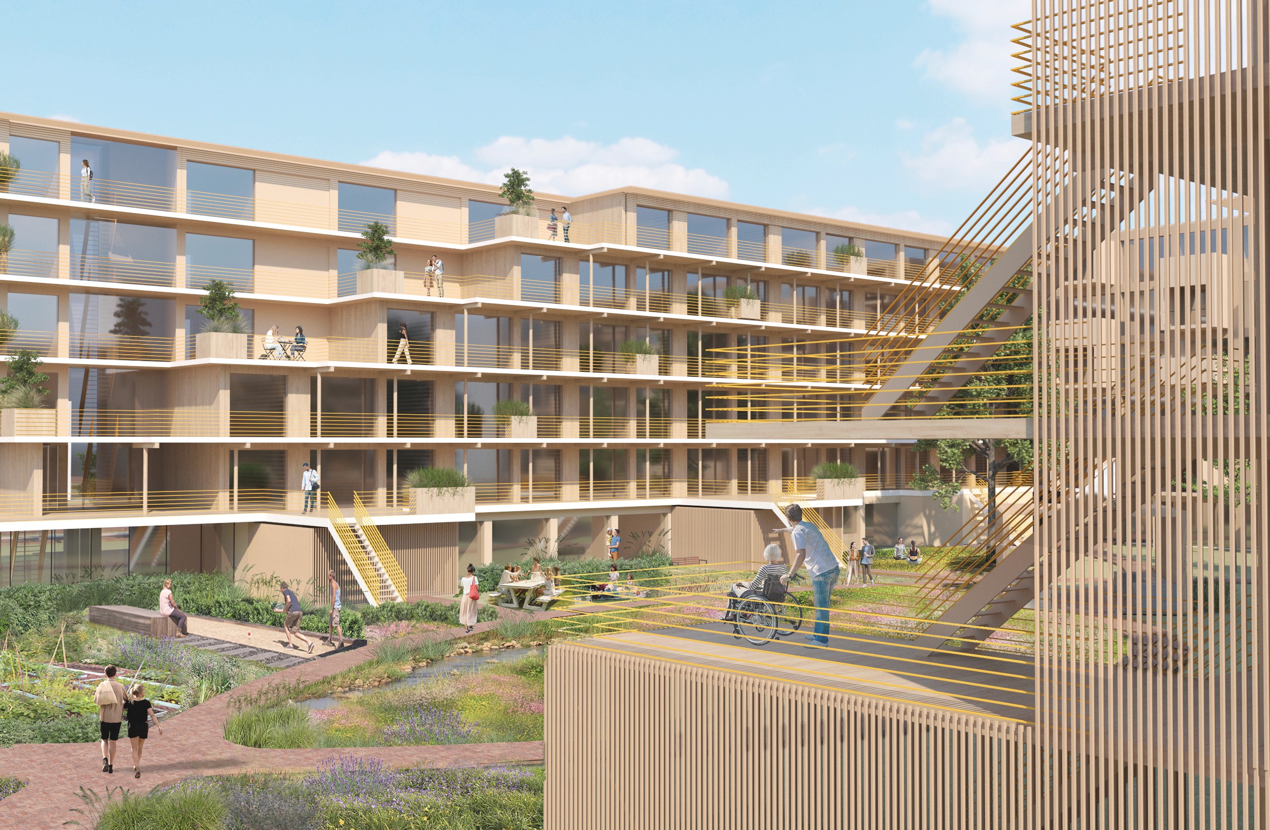 In this plan, we are creating 120 homes for young people and seniors. The green courtyard forms the heart of the project — a place where both target groups can meet and connect. A dedicated wing for seniors offers comfortable apartments designed for people with disabilities or care needs. The result is a living environment where everyone can feel at home, enjoying privacy and safe opportunities for interaction.