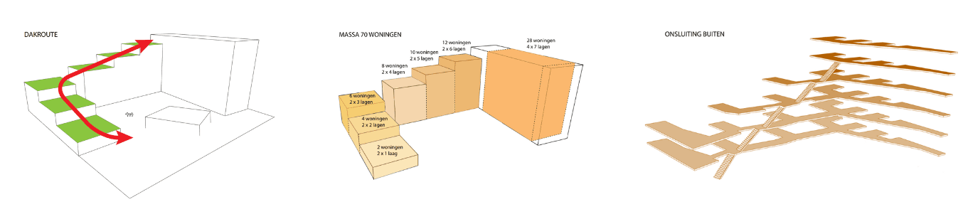 Step-Up is characterized by a stepped roofscape, culminating in a higher accent on the east side of the site. This iconic form will serve as a landmark in the future Hof van Holland neighborhood in Nijmegen. The shared rooftop gardens, connected by stairways, form a continuous route starting from the ground floor on the west side. The main entrance and lift are located on the northeast side of the building. The ground-floor garden fosters connections between residents while also linking the building to the surrounding neighborhood. Opportunities for communal vegetable gardens, seating areas, and a playground create a high-quality living environment.