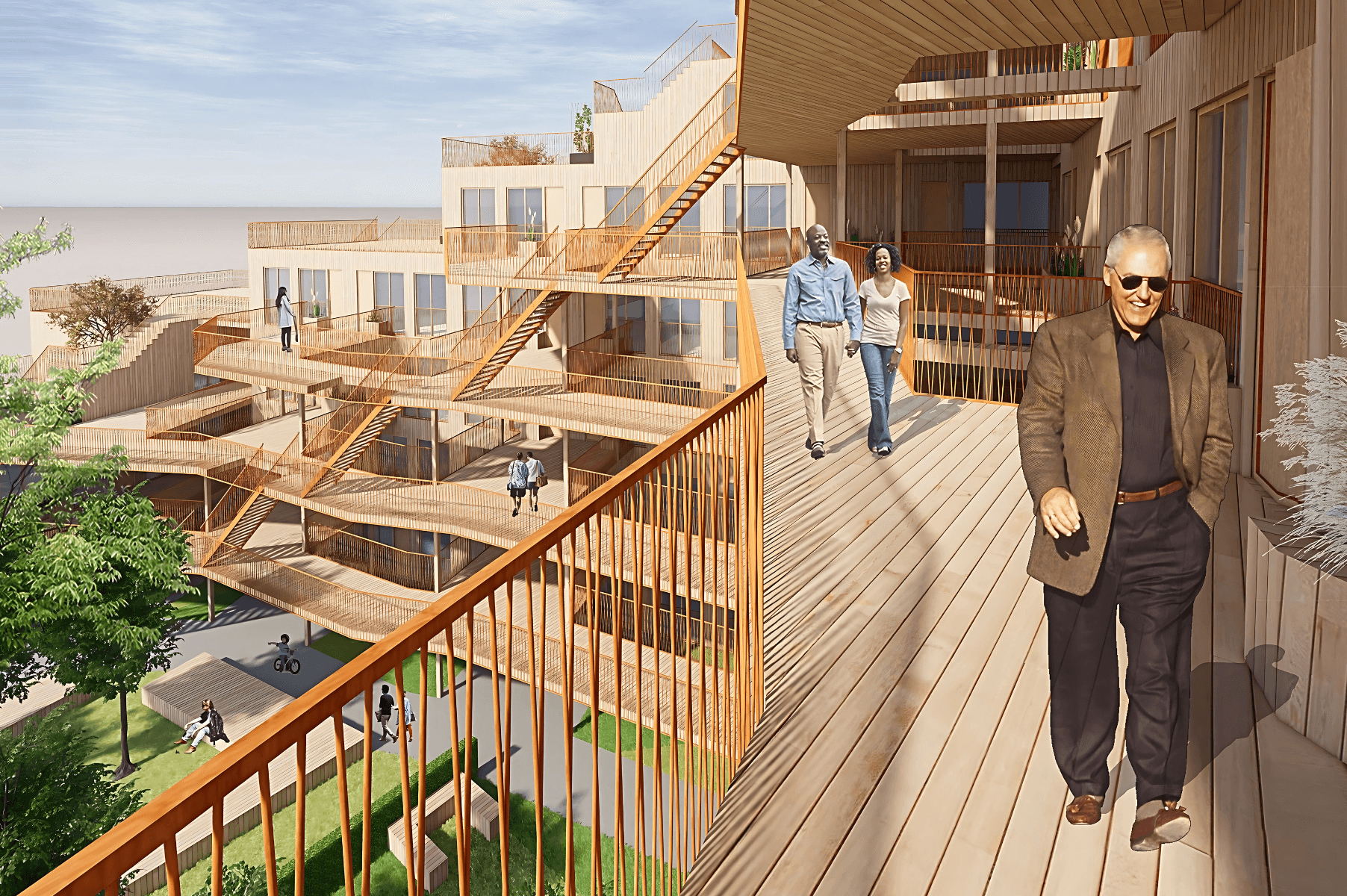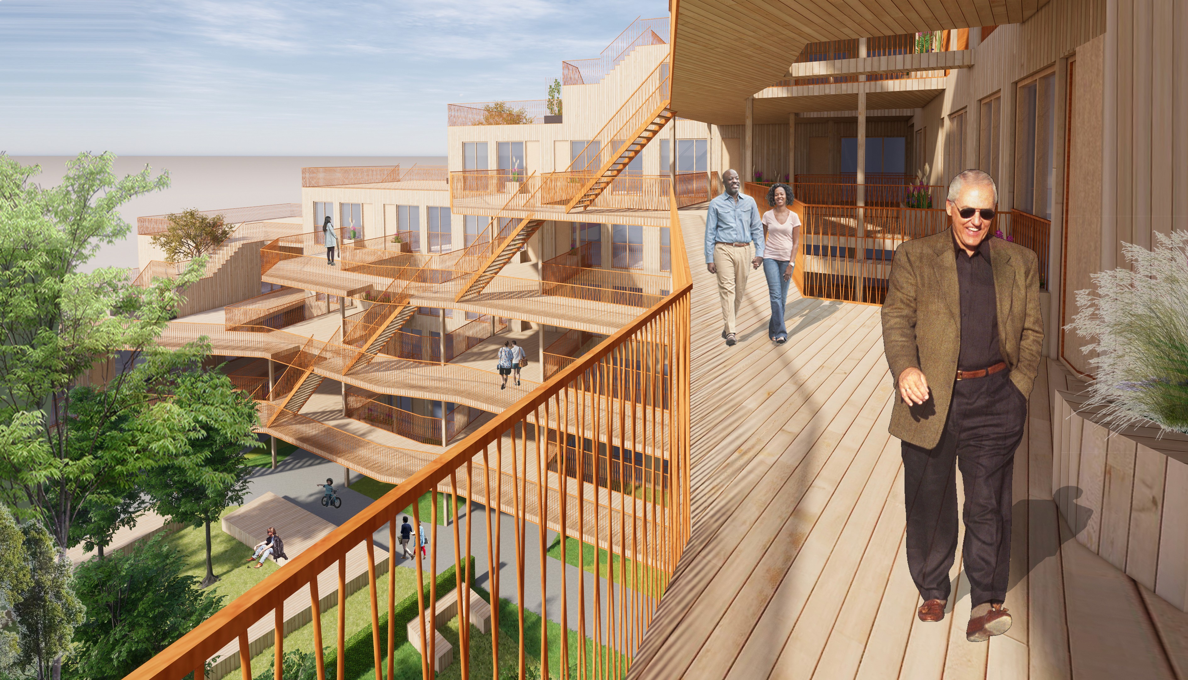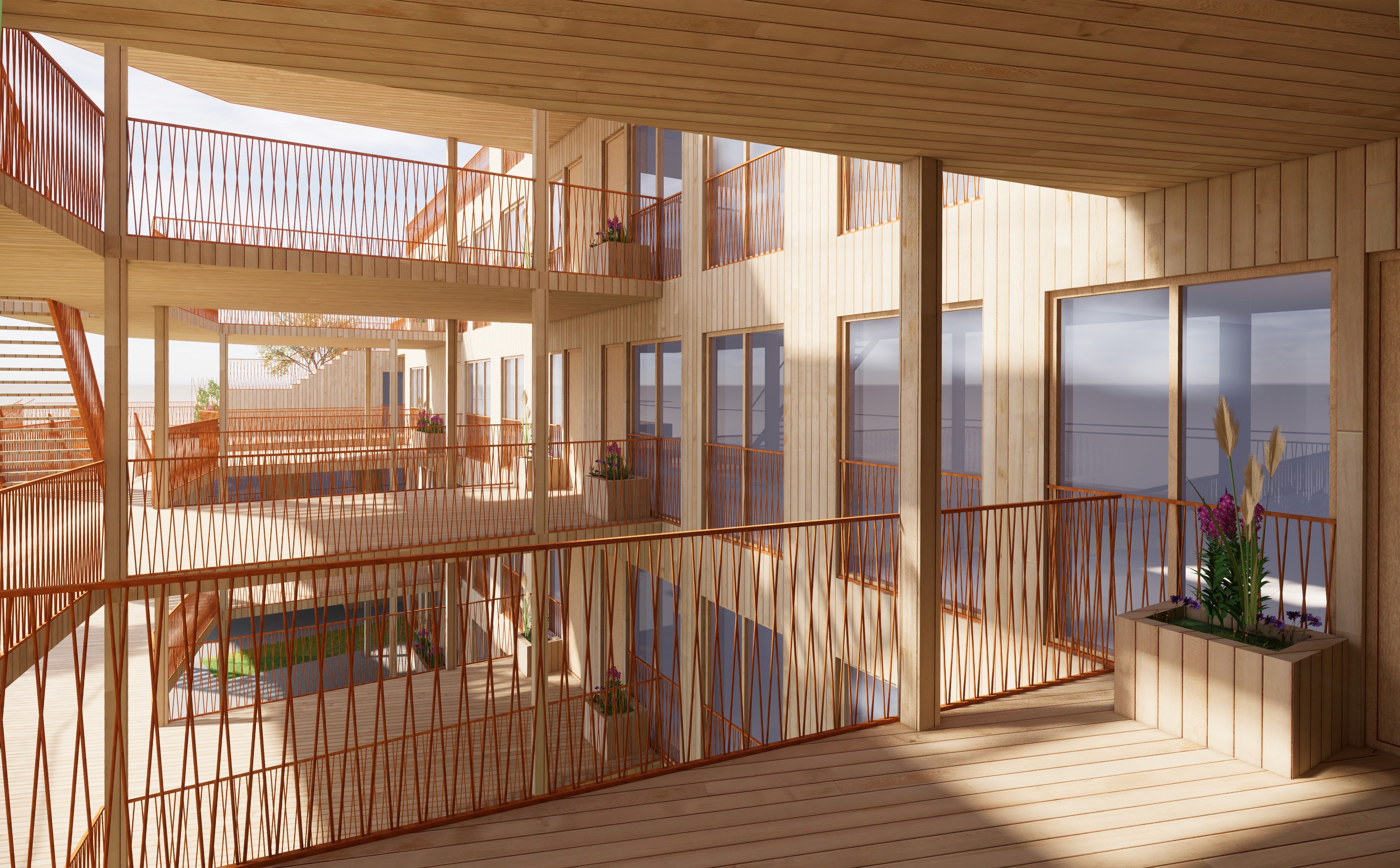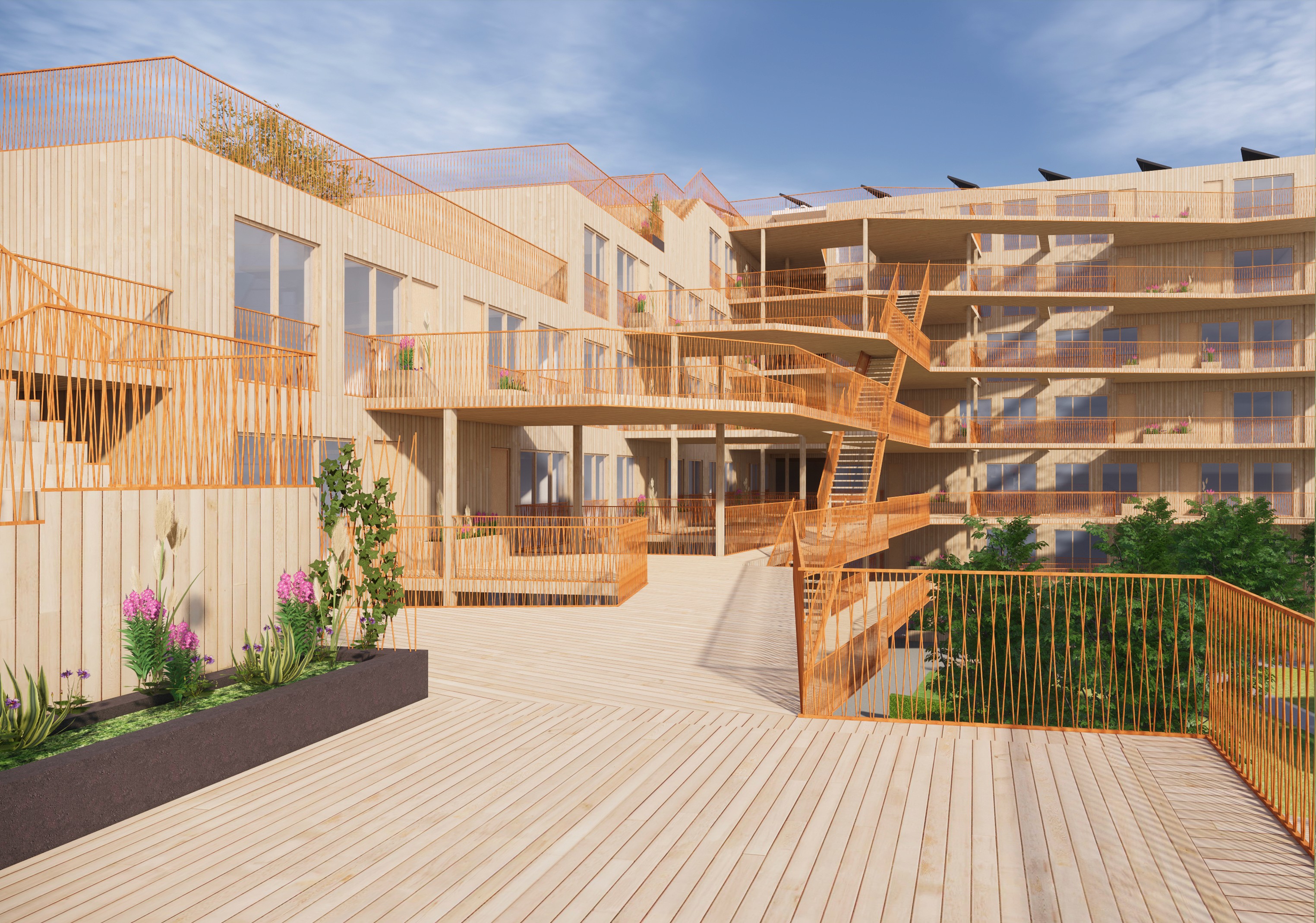 The building is accessed via three vertical cores combined with an open gallery structure. These galleries are wide, semi-public wooden streets, set apart from the façades. This arrangement creates space for bridges, making the environment light and airy. The favorable orientation and generous width of the galleries also allow them to function as an extension of the apartments themselves.