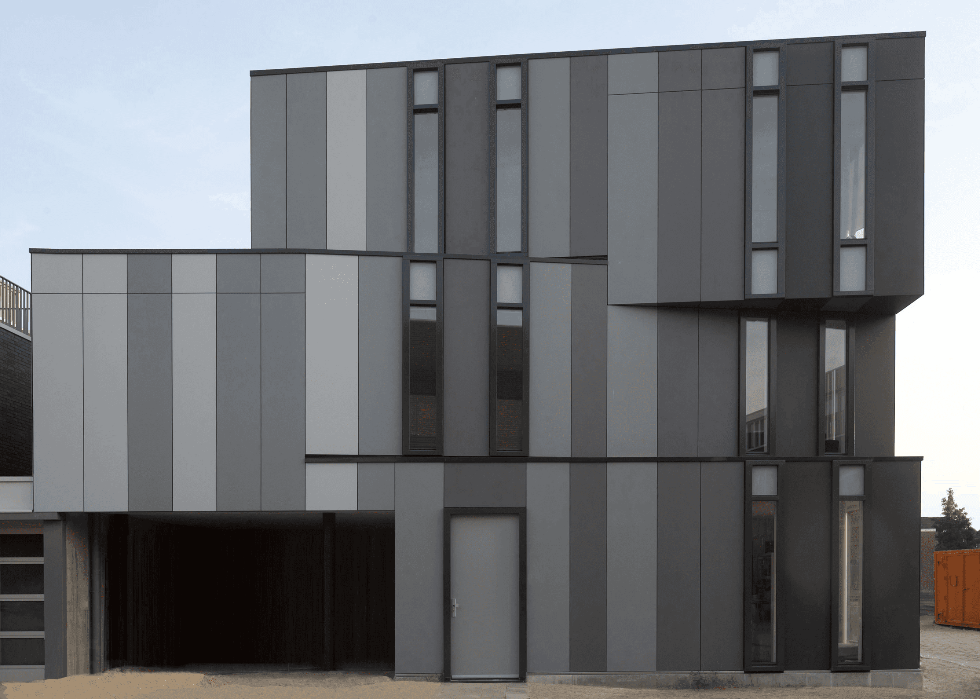 The façades were constructed using prefabricated wooden frame panels in varying shades of grey. The distribution of these tones accentuates the flowing transformation of the lateral façade. Extra-thick seams between the panels and the strongly profiled wooden window frames further enhance the vertical articulation of the exterior.
