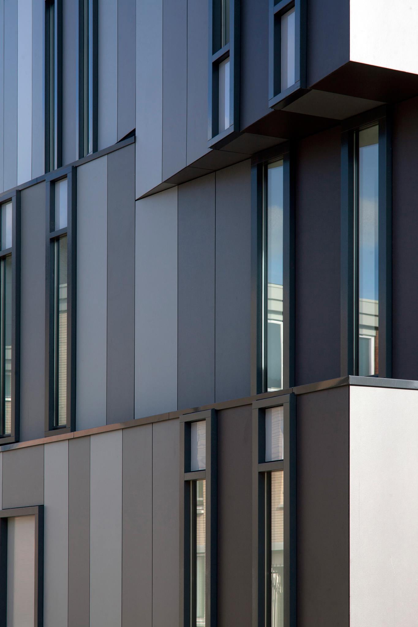 The horizontal transformation of the façade is accompanied by a vertical articulation expressed through the surface paneling and the window frames. The high, narrow windows emphasize the vertical rhythm while framing precise views from the interior and limiting direct visibility from outside.
